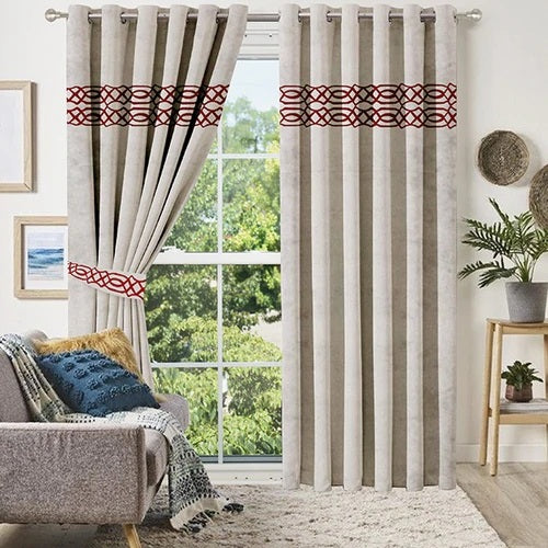 2 Pieces Crocodile  Luxury Velvet Curtain Panels with 2 belts-Beige/Maroon 02